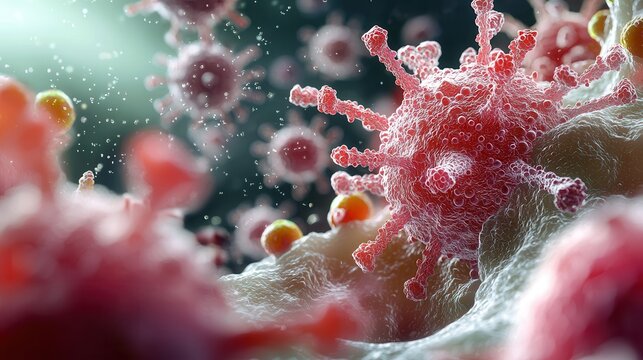 Microscopic View of Coronavirus Infection Detailed 3D Animation of Virus Cells Attacking and Spreading Highlighting the Pandemics Impact on Global Health and the Urgent Need for Medical Solutions.