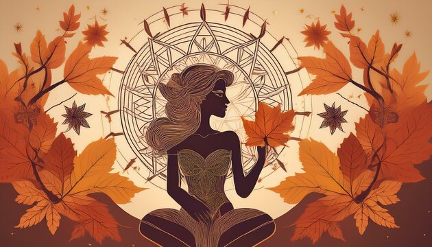 virgo themed design with earth toned mandalas sacred symbols and virgo maiden silhouette holding autumn leaves