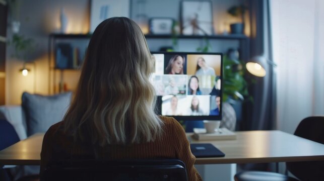 Rear view of a woman participating in a virtual meeting from her home office setup