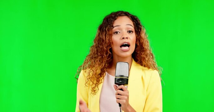 Dynamic businesswoman delivering confident presentation on green screen background, perfect for virtual meetings and announcements