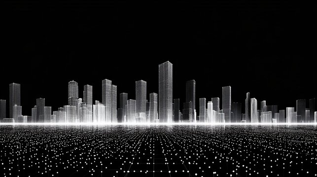 Abstract futuristic digital cityscape with transparent buildings and dotted architecture, showcasing a sci-fi skyline perspective, representing the concept of a modern city in a digital world
