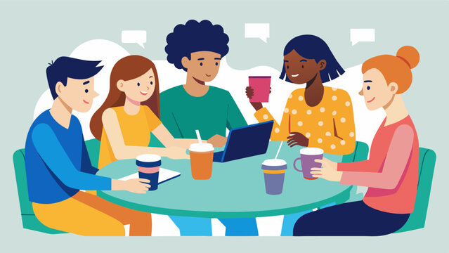 A group of students huddle around a large table discussing their group project and occasionally taking sips from their iced coffees.. Vector illustration