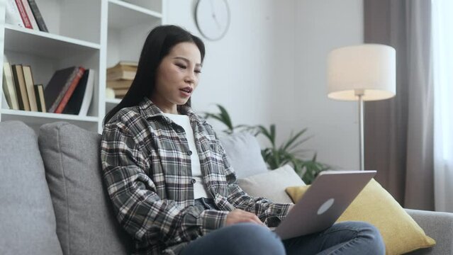 Woman in headphones having videocall using laptop, talking and gesturing