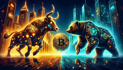 A cybernetic bull and bear, glowing with electronic circuits, stand opposed in a futuristic cityscape.