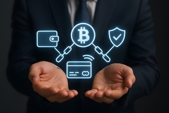Businessman holding cryptocurrency symbols representing digital finance and security