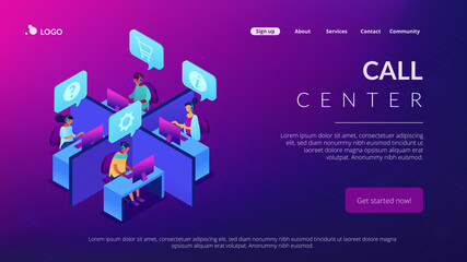 Customer service operators wearing headsets answering phones in the office. Call center, handling call system, virtual call center concept. Isometric 3D website app landing web page template