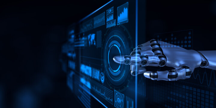 Robotic Hand Operating Futuristic Data Interface in Artificial Intelligence and Machine Learning Environment. 3d render.