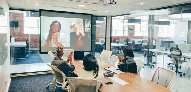 Global businesspeople clapping during a video conference