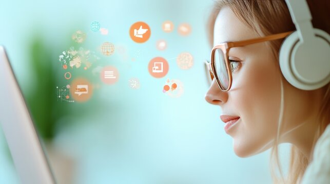 An office worker adjusts their headset and participates in a lively virtual team meeting with colleagues from around the world.