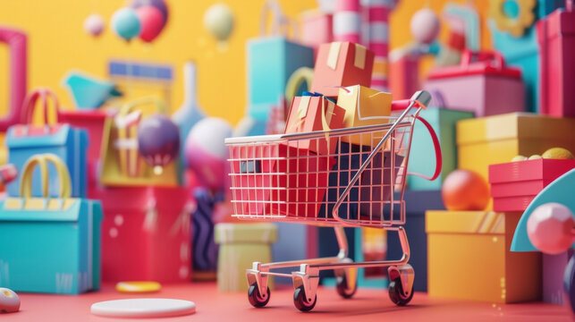 Online shopping concept. Small shopping cart with boxes on laptop keyboard. E-commerce business, monthly sales, revenue growth, product delivery, customer service. Retail, online store, virtual shop.