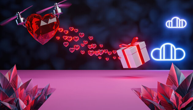 Generated image. Drone delivers a gift with heart-shaped elements in a colorful setting during a virtual event