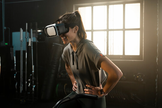 Beautiful girl rides an indoor bike simulator with a virtual reality headset