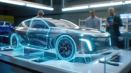 A state-of-the-art manufacturing facility, an engineer designs products in virtual reality while robotic systems assemble the real parts in the background