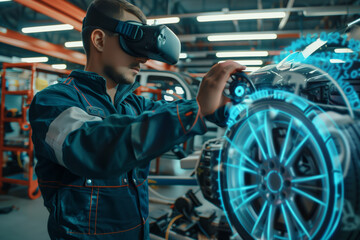 Mechanic Using Augmented Reality During Car Repair In Modern Shop