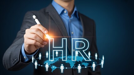 Businessman selecting a candidate profile on virtual screen, representing recruitment, hiring process, talent acquisition, human resources management, business partnership for organizational growth.