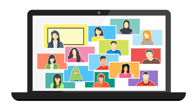 Online Class. Pupils or students studying with computer at home. Stay school learn from home via teleconference. Video conference call on laptop during coronavirus quarantine. Illustration