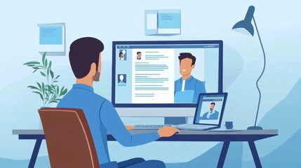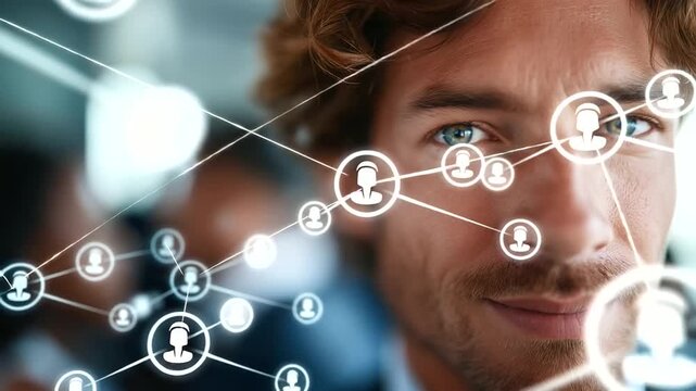 Job fair concept crop below eyes background softly defocused recruitment and onboarding program applicant hiring businessman with virtual job fair icons talent search career