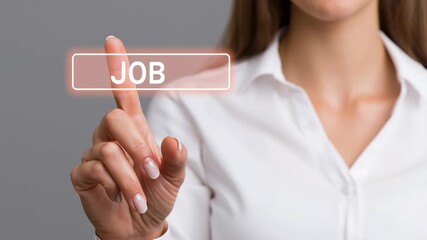 Businesswoman finger touching transparent search bar with job text, professional woman white shirt, career search, employment opportunity, modern technology, confident expression, digital interface