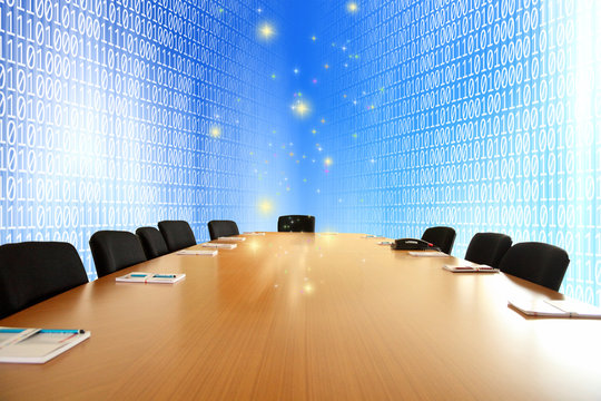 Cutting edge conference room with advanced tech and futuristic data visualizations