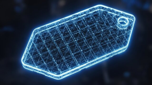 Abstract digital price tag illustration neon blue glowing on dark background