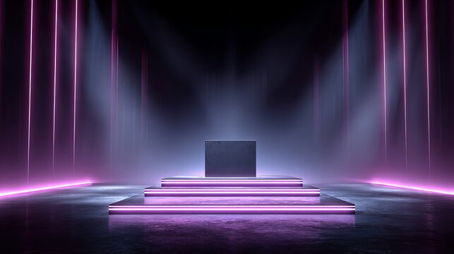 Futuristic stage with glowing geometric shapes and podiums, perfect for product launches or awards ceremonies.