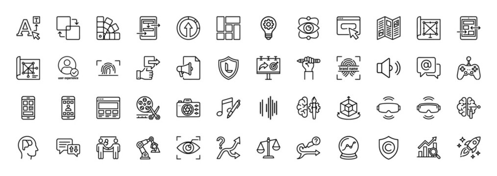 Creative and technology line icon set. Vector pictograms of design, user experience, brand, robotics, and virtual reality, thin linear illustration.