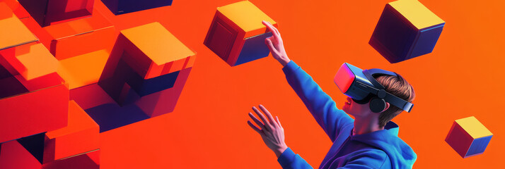 Immersed in vibrant virtual reality, person interacts with colorful 3D cubes, showcasing excitement of technology and innovation. dynamic scene captures essence of modern gaming and digital experience
