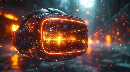 A stunning virtual reality headset shown in a futuristic setting, with bright neon lights and a dynamic atmosphere, perfect for immersive experiences.
