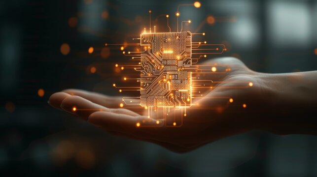 A glowing microchip floating above an open hand symbolizes advanced technology and innovation. Perfect for themes of AI, computing, and the future. AI generated.