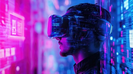 A child engages with virtual reality technology, immersed in a captivating digital world filled with vibrant graphics and data streams, showcasing innovation and creativity.