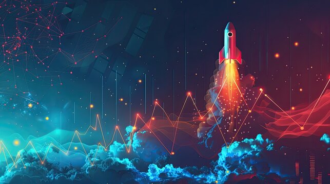 Increasing trend lines on a Bitcoin graph with a rocket, symbolizing the explosive growth of the cryptocurrency market. AI generative illustration.