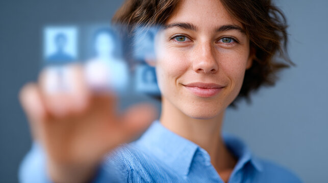 Woman holds virtual images in office. A woman is showing digital images on a screen in an office setting during daytime. She appears focused and engaged.