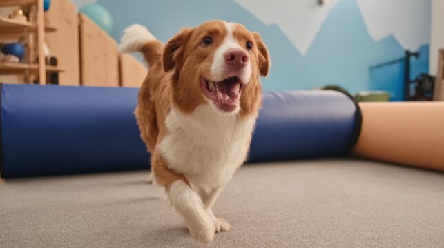 Medium shot of a dog enthusiastically participating in an online virtual agility class navigating obstacles and enhancing coordination during interactive pet fitness sessions.