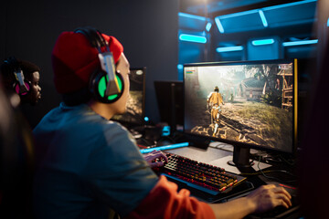 Virtual classroom with diverse students attentively facing a large screen, various subjects displayed in blurred windows, educational setting.