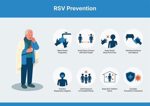 RSV prevention infographic showing steps to reduce respiratory syncytial virus transmission, medical graphic for healthcare awareness and public health campaigns. Flat vector illustration