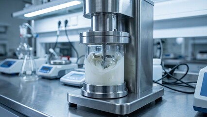 Laboratory equipment mixing white viscous liquid in a beaker scientific research equipment