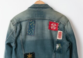 Light blue denim jacket hanging on wooden hanger showcasing visible mending, colorful embroidered patches, promoting sustainable fashion and textile reuse