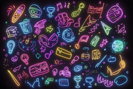 Neon outline of a vision board with quotes, images, and goals isolated on black background.