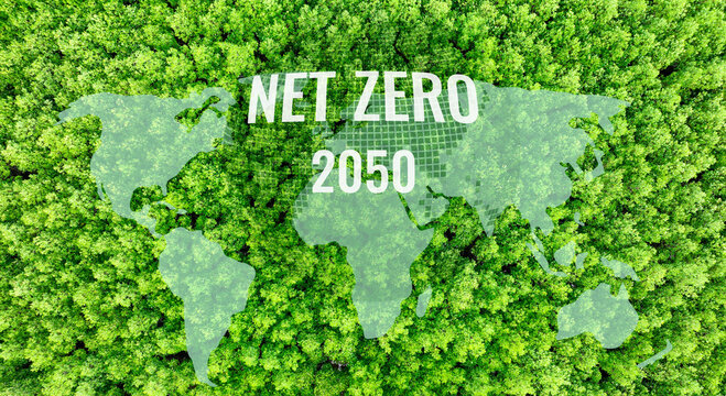 Net Zero target for 2050. Business strategy for reducing greenhouse gas emissions. Climate neutrality. Sustainable future. Green business roadmap to 2050. Corporate commitment to net zero emissions.