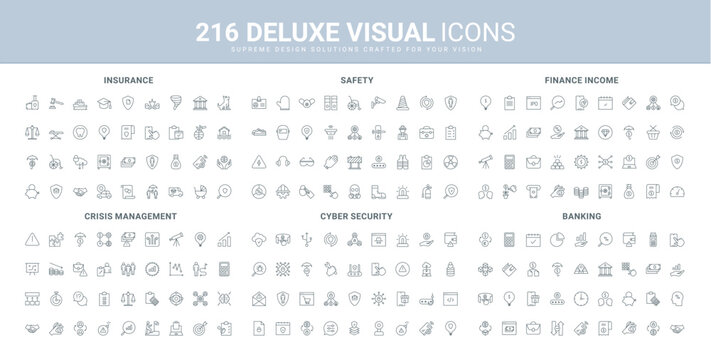 Deposit, car and home insurance, vision of hazards, contact and crisis risks line icon set. Financial income, cybersecurity, maintenance worker safety thin black outline symbols vector illustration