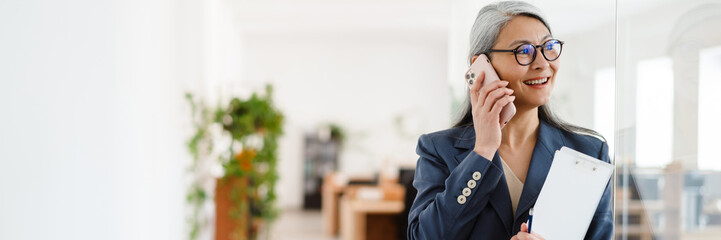 Businesswoman communicating on cellphone in modern office