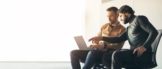 Busy confident serious caucasian millennial businessmen with laptop talk about work at office interior