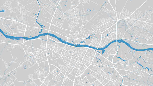 Vistula river map, Warsaw city, Poland. Watercourse, water flow, blue on grey background road map. Vector illustration.