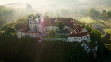 Aerial drone view of Benedictine Abbey over Vistula river in Tyniec in the morning fog, Krakow, Poland