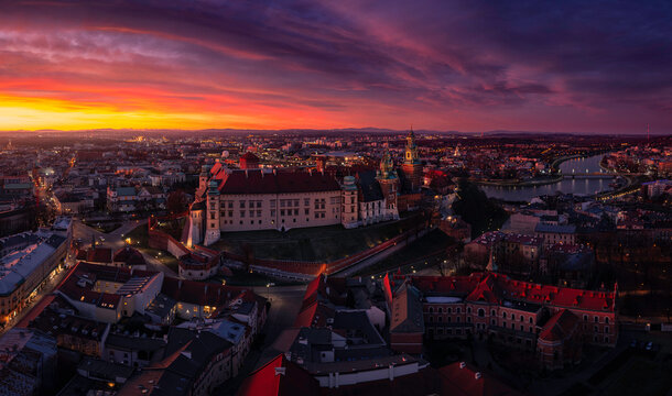 Aerial view of Old Town with Wawel Castle in Krakow during colorful dawn in dark mood.