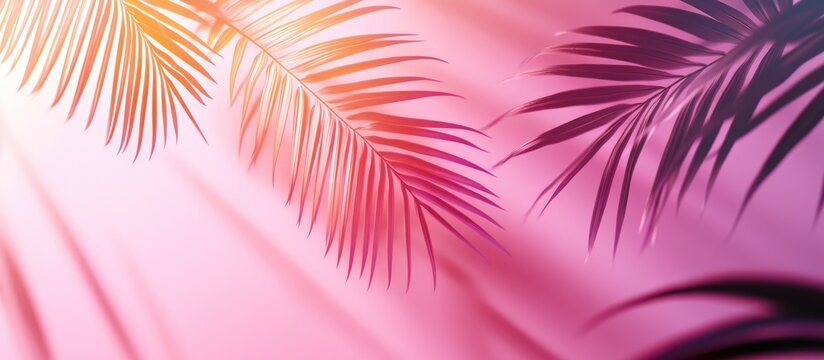 3D rendering of blurred palm leaf shadows on a light pink wall creating a minimal abstract background ideal for product presentation