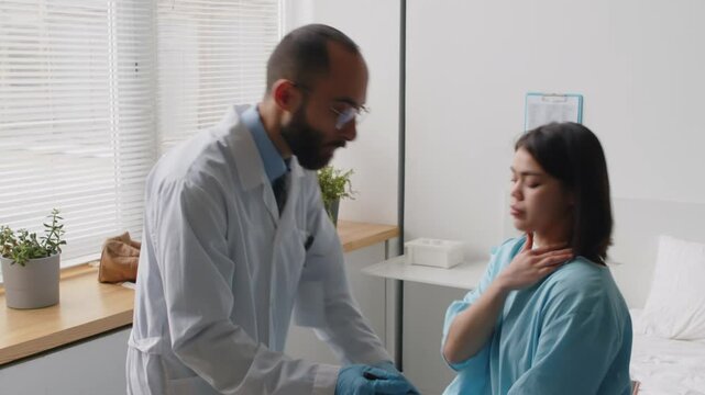 Plastic surgeon showing young female patient images of before-and-after surgery results and then drawing lines on her face with marker pen during preparation for procedure in clinic