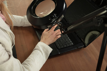 Grandma using magnifying glass to determine pill name