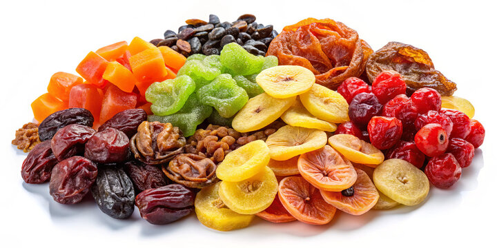 A vibrant assortment of dried fruits showcases a variety of colors and textures. Pieces include dates, apricots, cherries, and candied citrus, all neatly arranged for a pleasing visual appeal