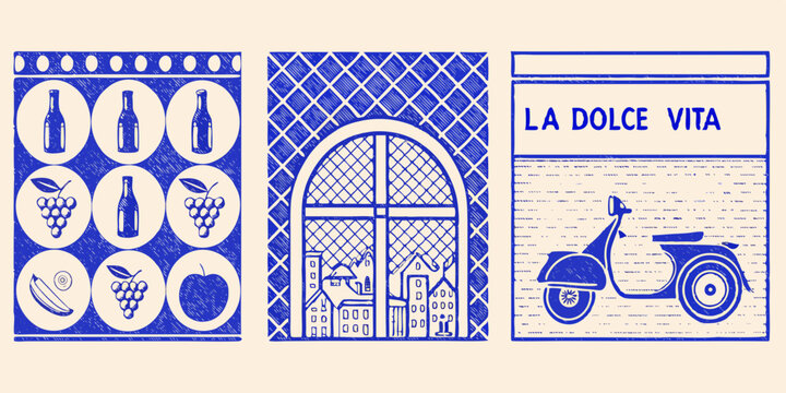 A charming illustration celebrating italian culture with la dolce vita text a scooter and a collage of wine bottles and fruit